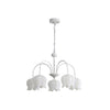 Ce lustre est doté d'abat-jour cloche en muguet blanc doux, de bras gracieusement courbés et d'une colonne centrale ornementée. Sa finition blanche et sa suspension à chaîne réglable en font un luminaire idéal pour les intérieurs raffinés, offrant un éclairage doux et équilibré dans toute la pièce.
