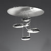 Pendant la journée, la pièce agit comme un objet sculptural, reflétant la dynamique de la lumière naturelle et les mouvements des personnes autour d'elle. Unités d'éclairage en aluminium moulé sous pression ; unités réfléchissantes en matériau thermoplastique injecté avec finition métallique ; réflecteur en aluminium moulé sous pression.