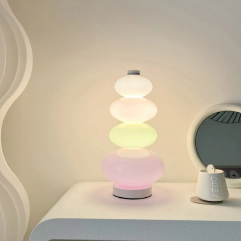 - D'une teinte de verre rafraîchissante et d'une forme à la fois simple et élégante, l'apparence générale de la lampe rappelle celle de délicieux bonbons. Les courbes gracieuses et les lignes douces des boules de verre ovales convergent harmonieusement, résultat de l'intelligence du designer combinée à des matériaux naturels de haute qualité. Cette synergie ne rend pas seulement la lampe visuellement enchanteresse, mais lui confère également un caractère ludique, la rendant polyvalente et adaptable à une myriade d'environnements.